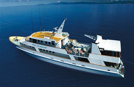 Spirit of Freedom is Australia’s most comfortable live aboard diving vessel offering the best dive cruising to the Great Barrier Reef and remote Coral Sea reefs out of Cairns in tropical north Queensland. During your dive trip you will be treated to first class chef prepared meals and complimentary wine with your evening meal after an amazing day of diving. There are three decks on Spirit of Freedom with a separate lounge, dining and under cover top deck providing plenty of space for up to 26 guests. The 11 generous air-conditioned cabins all containing private bathrooms make for a very comfortable live aboard diving adventure to the Great Barrier Reef.