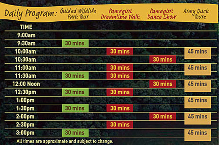 Show Times: 10.30am, 12noon, 2pm Dreamtime Walk Times: 10am, 11am, 11.30am, 12.30pm, 1.30pm, 2.30pm