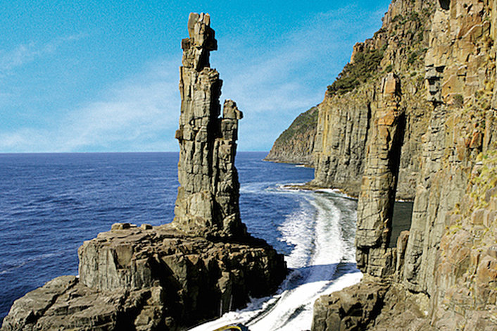 On this tour you will see Bruny Island’s highest mountains, and at sea level you will be awed at the sight of the sheer cliff-face plunging into the rolling surf. You will cruise beneath towering crags and pass through the narrow inlet formed by the coastline and ‘The Monument’, the 30 metre high dolerite stack that will take your breath away.