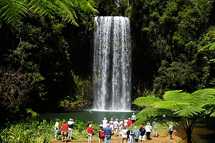 After a 30 minute drive through the Malanda dairy lands, we arrive at the Millaa Millaa Falls - with the option of swimming under the cool waters falling 20 metres over an ancient volcanic lava flow from over 1 million years ago.